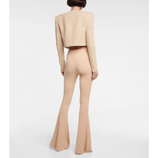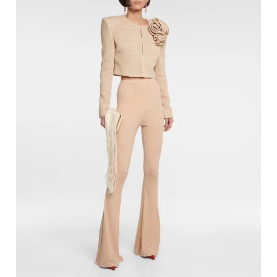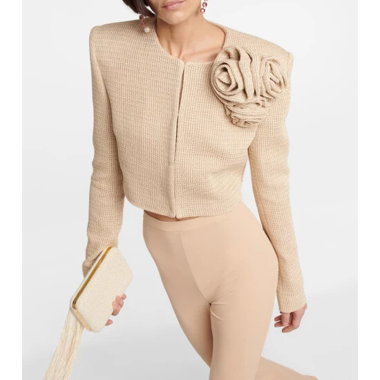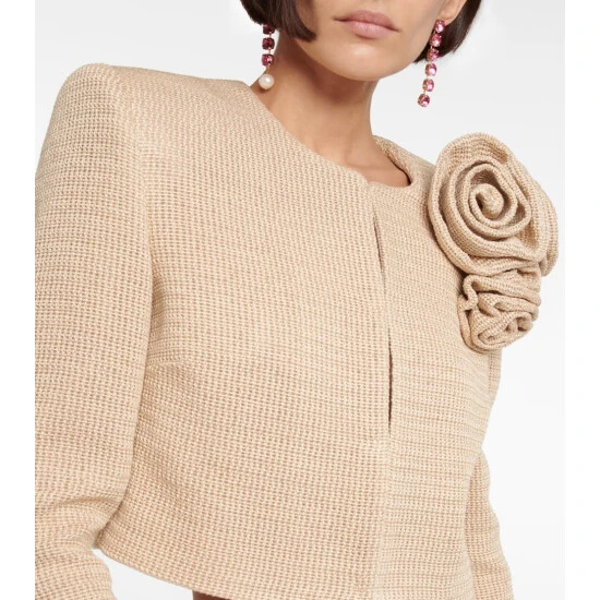 This sophisticated jacket from Magda Butrym is completely handwoven on a traditional loom. Designed with a cropped silhouette, the style has a collarless neckline, boxy fit, and is embellished with detachable brooch with roses.