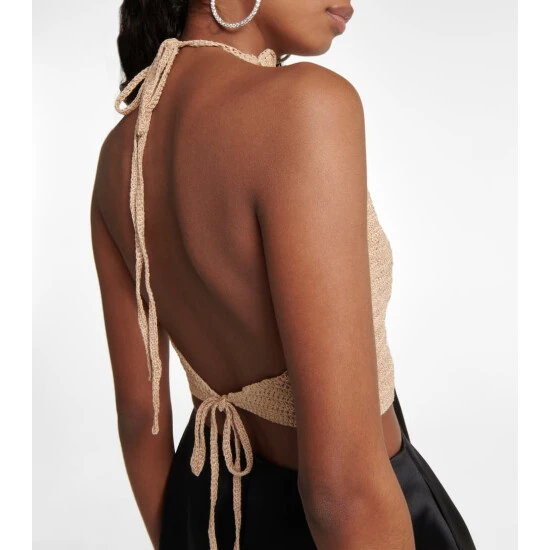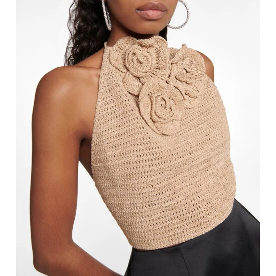 All of Magda Butrym’s crochet styles are made by hand in Poland by a team of skilled craftsmen. This cropped halter top is detailed with signature crocheted flowers and has a low, open back.