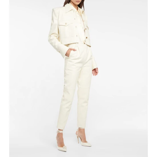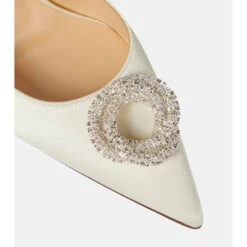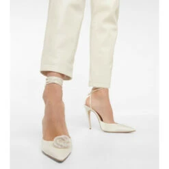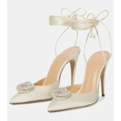 Call upon your glamorous side and slip into these white satin pumps from Magda Butrym. This pair has high stiletto heels, elegant wraparound ankle ties, and crystal embellishment on its pointed toes.