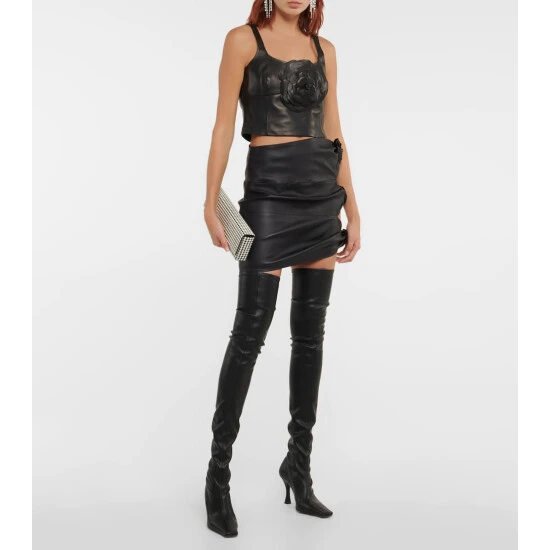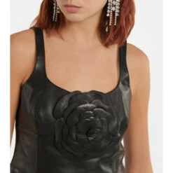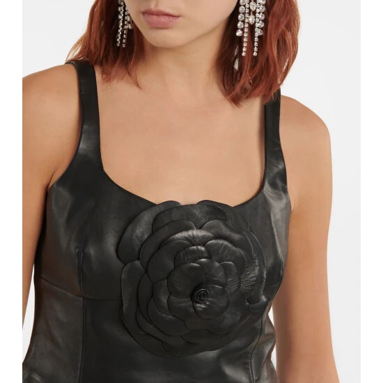 This tank top from Magda Butrym is glamorous and edgy at once. Made from black leather, the style has a corset fit, large romantic leather flower at the chest, and a zipper at the back.