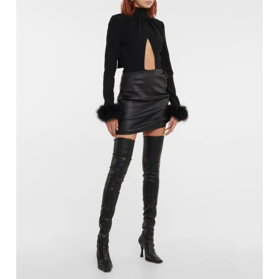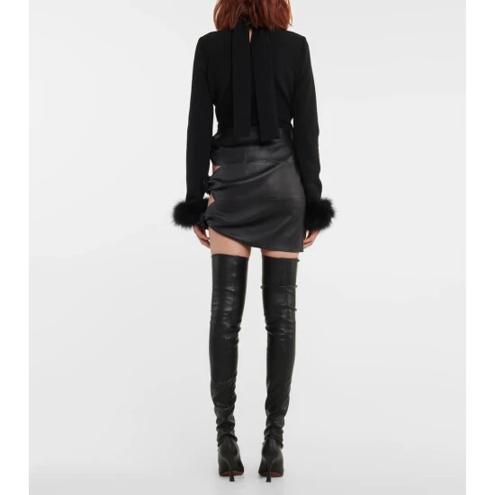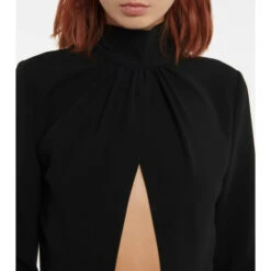 This bodysuit from Magda Butrym blends elegance with opulence. The long-sleeve turtleneck style features an alluring cutout and is accented with a plume of feathers on each sleeve for extra glam.