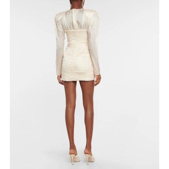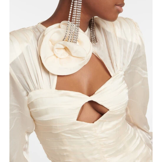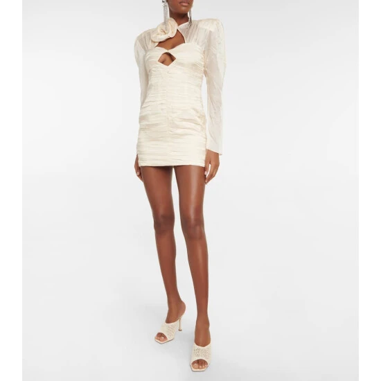 Whether as a bridal alternative or occasionwear, this Magda Butrym minidress is sure to turn heads. Cut from lustrous silk satin, it has a dramatic rose appliqué, cutout bust, and fully pleated bodice and skirt.