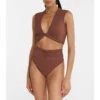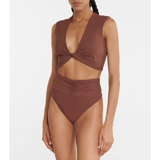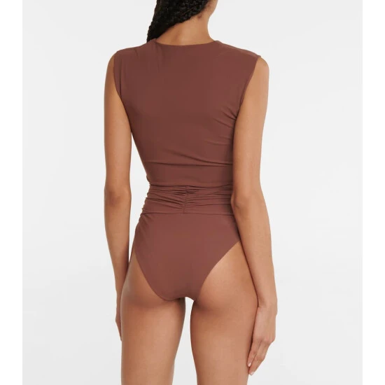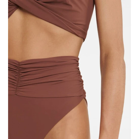 Magda Butrym’s eye for sculptural design extends to swimwear with these high-rise bikini bottoms. In brown, they’re flatteringly ruched across the midriff, and have high-cut legs for elongating effect. Please note they offer minimal coverage.