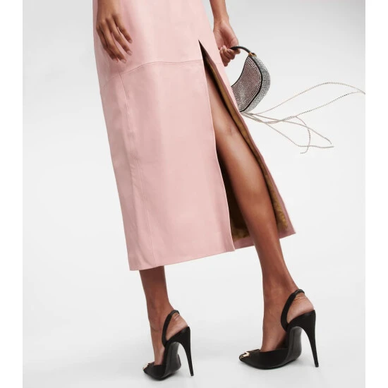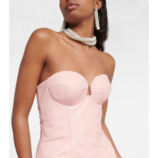 Magda Butrym updates the label’s signature bustier corset midi dress with an iteration in rosy pink leather. The style has a rounded cups with retro flair, a tight bodice, and a figure-hugging skirt.