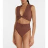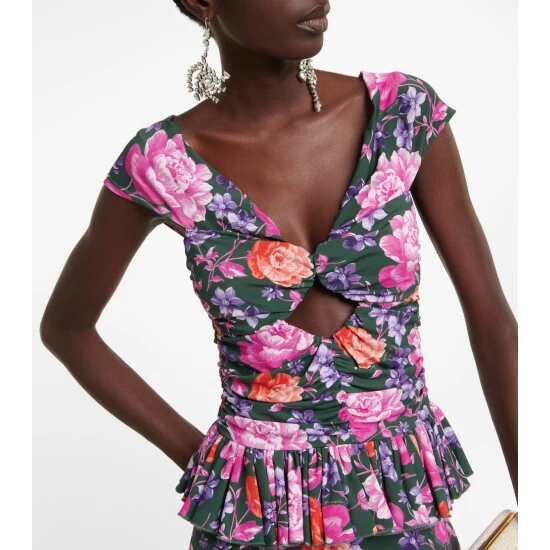 This off-shoulder top from Magda Butrym features a charming floral print all over. It’s designed with a fitted peplum silhouette and has a keyhole cutout at the bust.