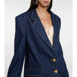 Denim fans will flock to Magda Butrym – the brand’s take on the oversized blazer is ever so covetable. Take note of the considered topstitching and rosette-shaped buttons.