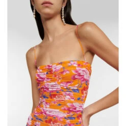 This midi dress from Magda Butrym has elegant ruching throughout. Made from stretchy mesh, it features a colorful floral motif and wispy shoulder straps.