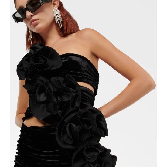 Make an unforgettable entrance in this romantic velvet minidress from Magda Butrym. The sleeveless style has a second-skin fit, alluring cutouts, ruching all over, and silk flowers cascading down the front for a feminine touch.