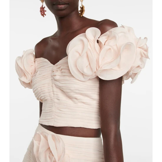 Trust Magda Butrym for delicate pieces, such as this pink chiffon crop top, made from pure silk. The design features undulating horizontal pleats and straps with sculptural flowers that can be worn off or on the shoulder.