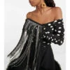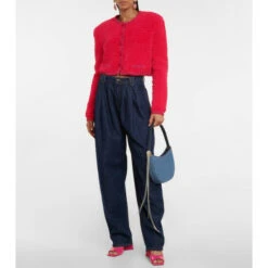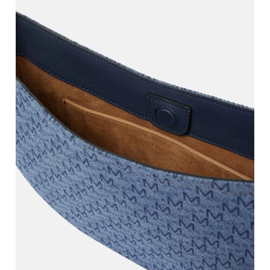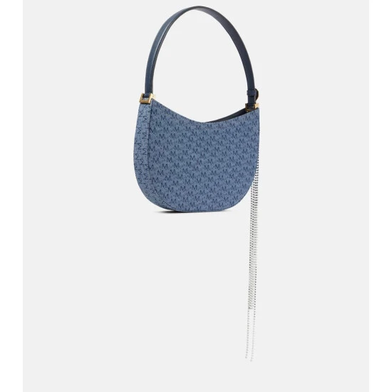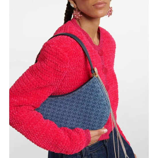 Magda Butrym unites monogrammed denim and embellishment with the Vesna shoulder bag. Featuring a leather strap and suede lining, the design includes a moonstone and dangling silver crystal bands on one side.